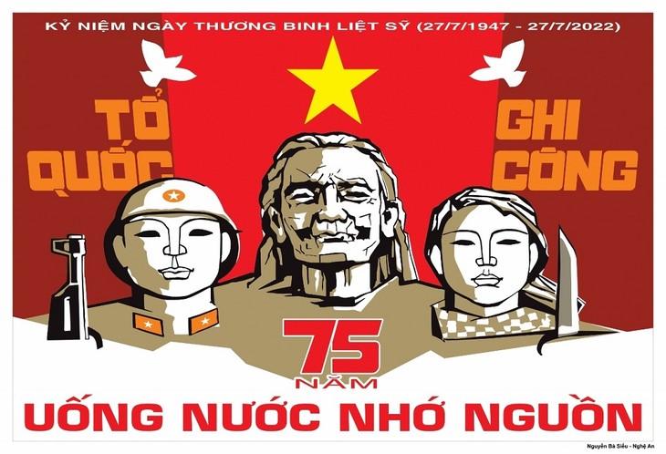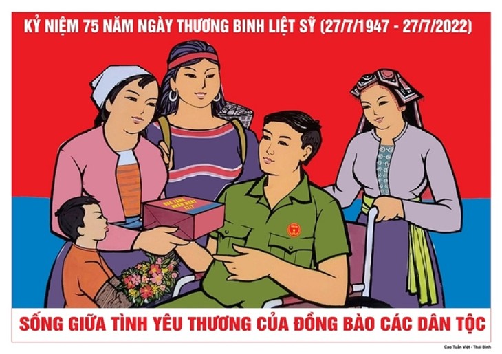 A poster by Nguyen Ba Sieu from Nghe An provinceMany artworks have highlighted outstanding results of policies and programs for revolutionary contributors, war invalids, sick soldiers, martyrs' families, and Vietnamese heroic mothers, and for the search and retrieval of martyrs' remains. |