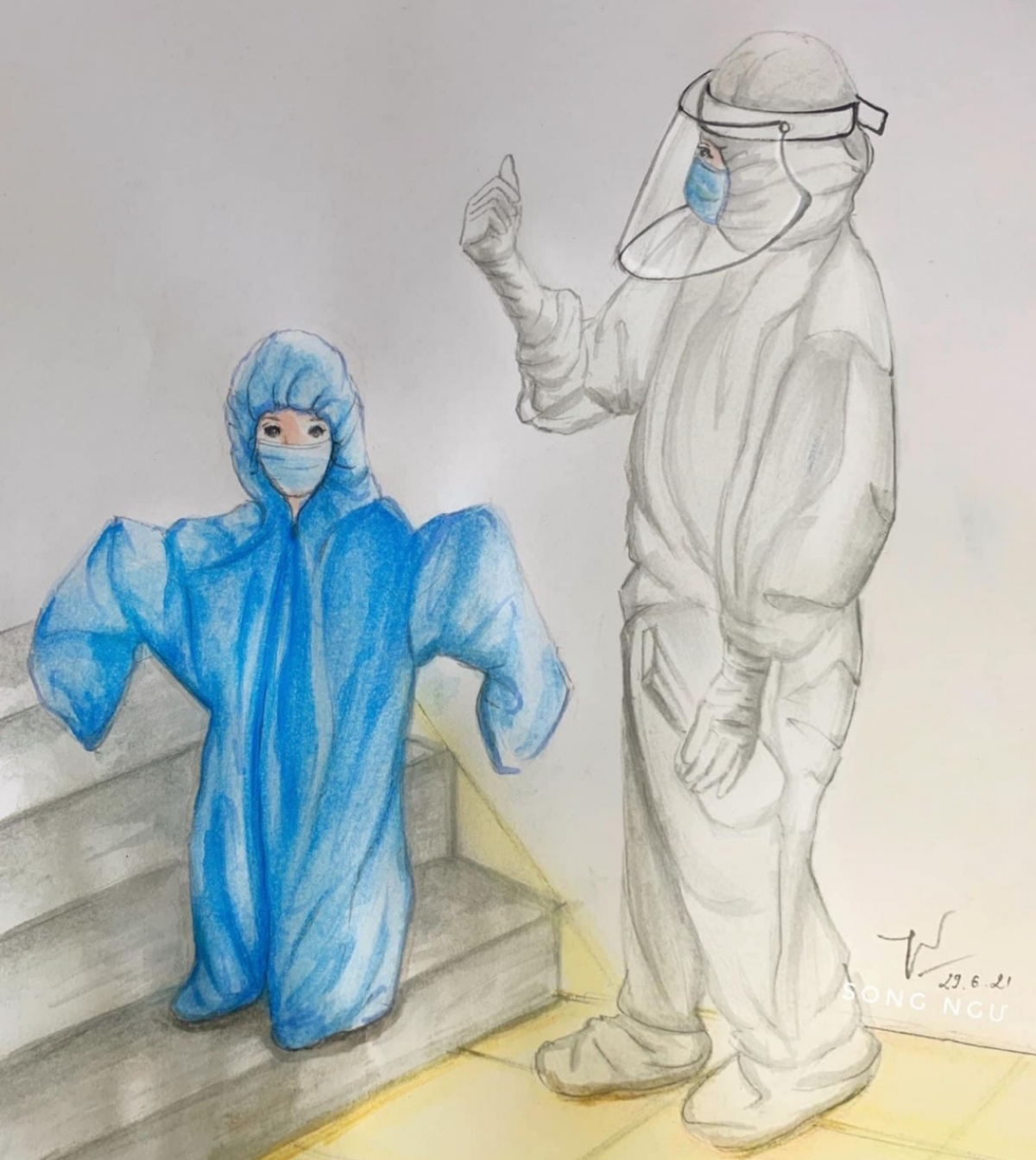 Nguyen Thi Hong Yen, a 37-year-old arts teacher from Nguyen An Ninh secondary school in Vung Tau city, has uploaded her paintings on Facebook to show her gratitude to frontline workers. A painting depicts the great determination of a healthcare worker in the ongoing fight. |