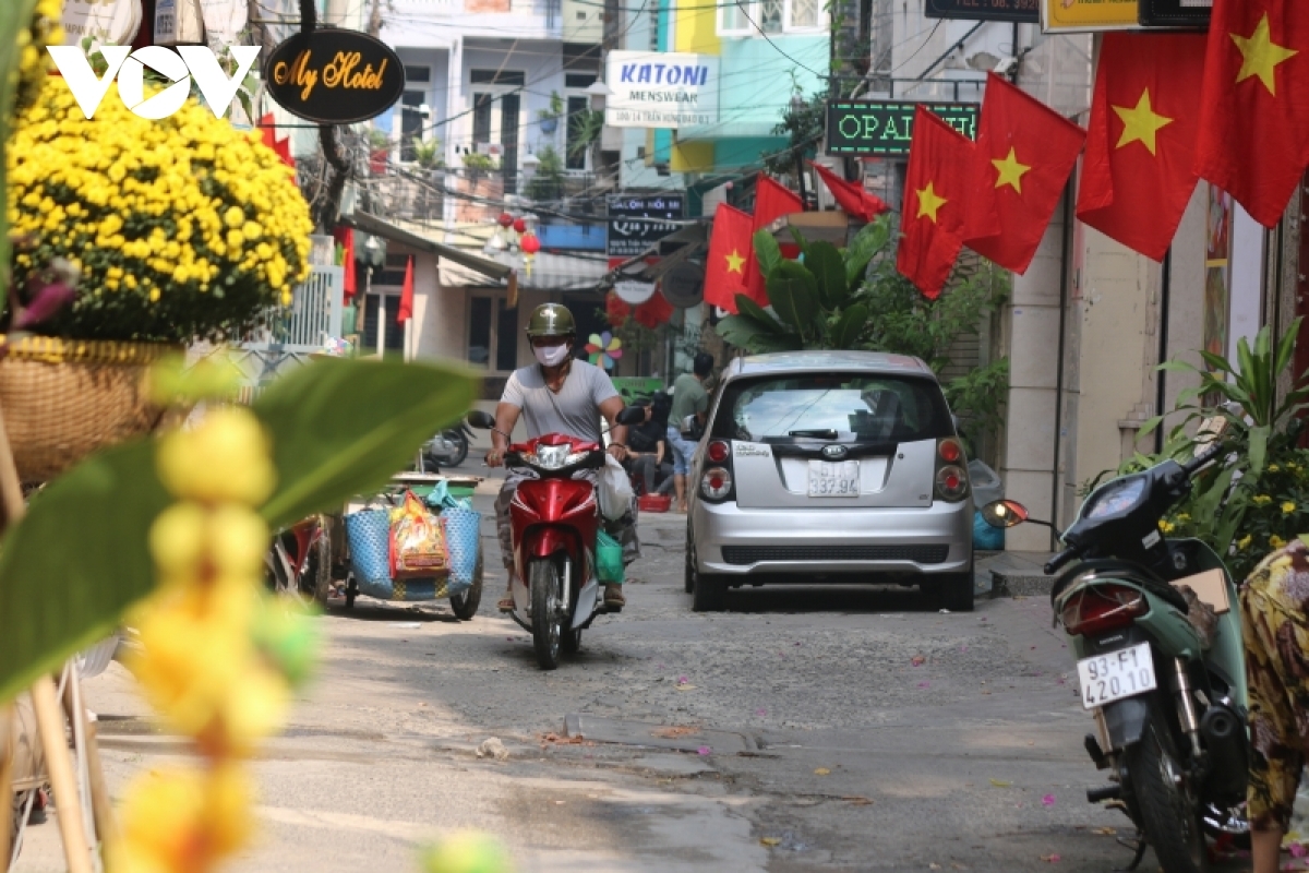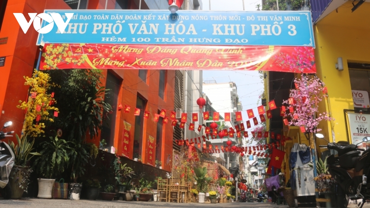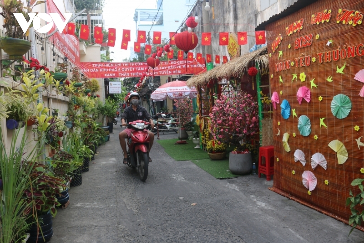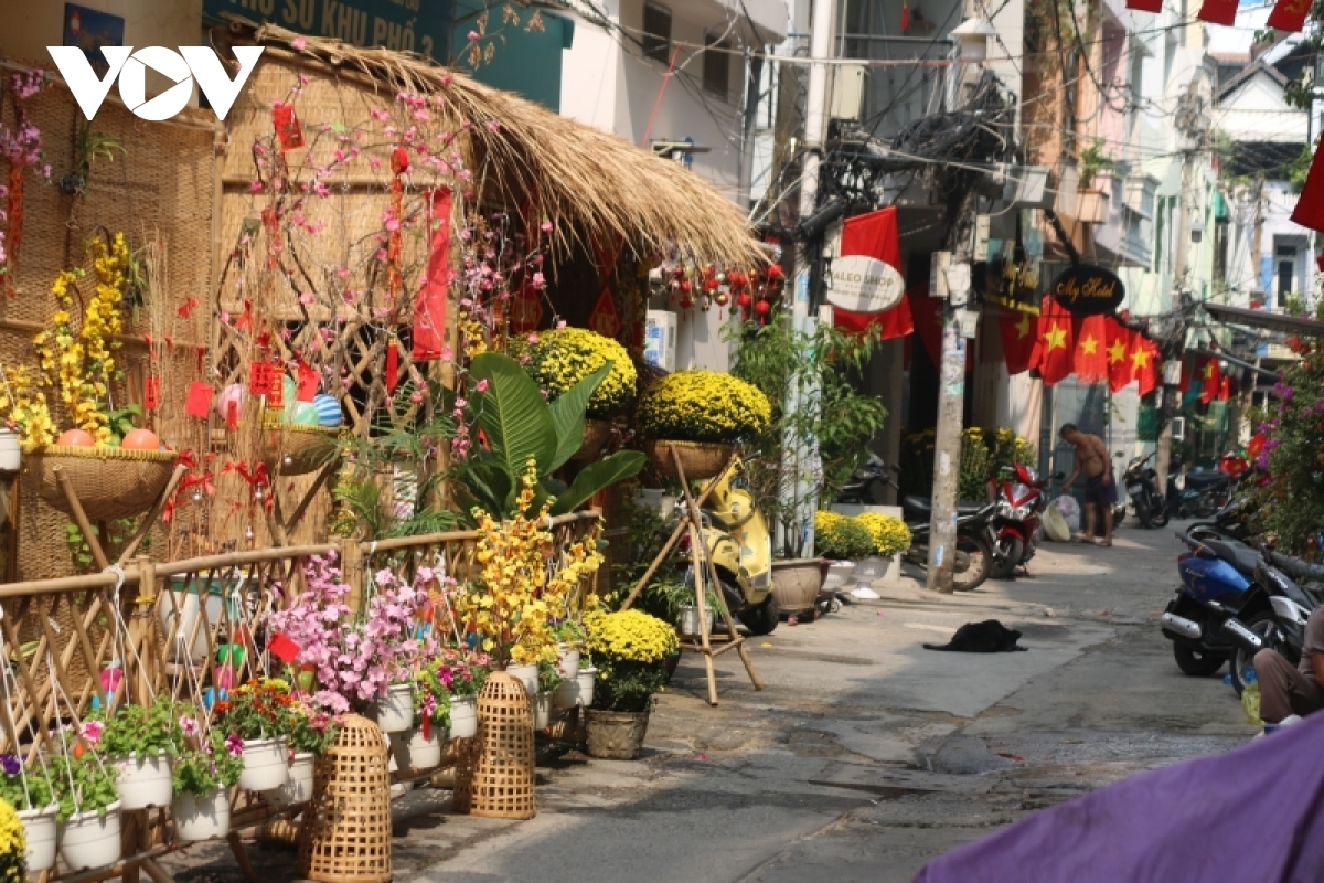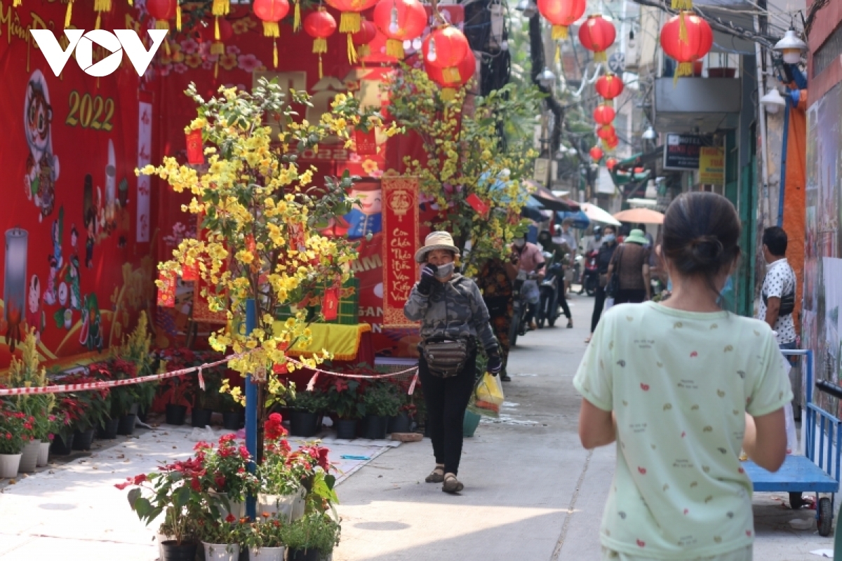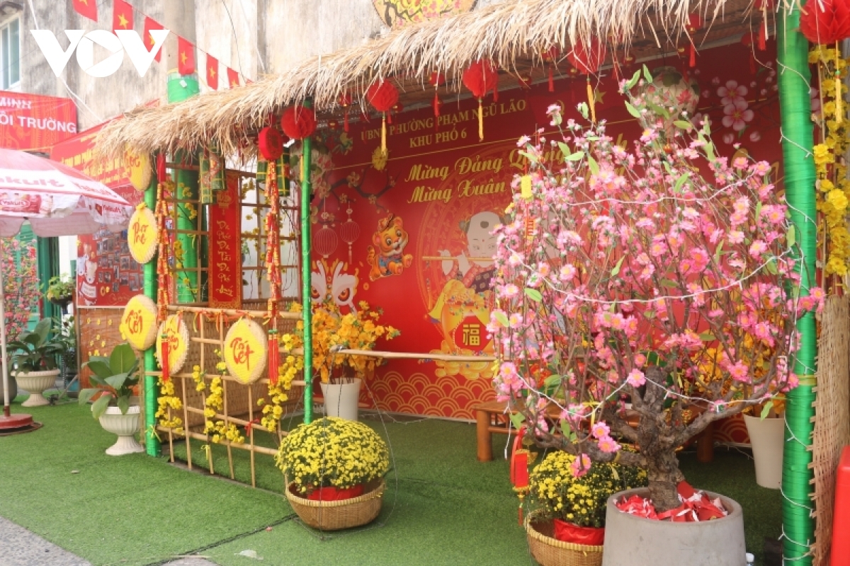 | An alley on Pham Ngu Lao street is covered with festive lanterns and yellow apricot flowers signaling the arrival of spring. |