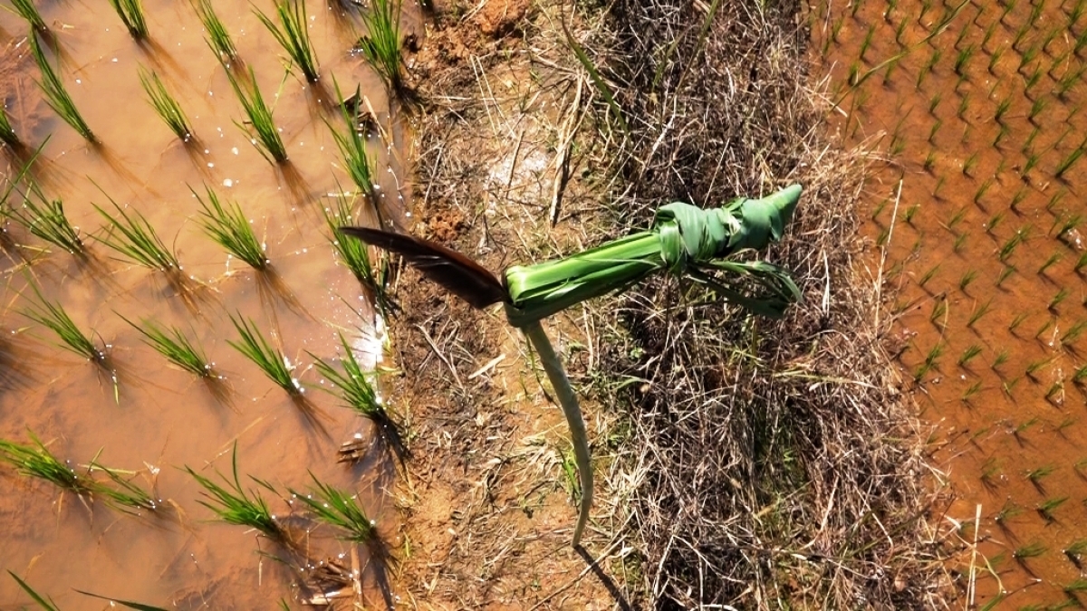 Rooster’s feathers are plugged in terraced fields, representing a prayer of locals for the gods as they seek to protect their fields. |
