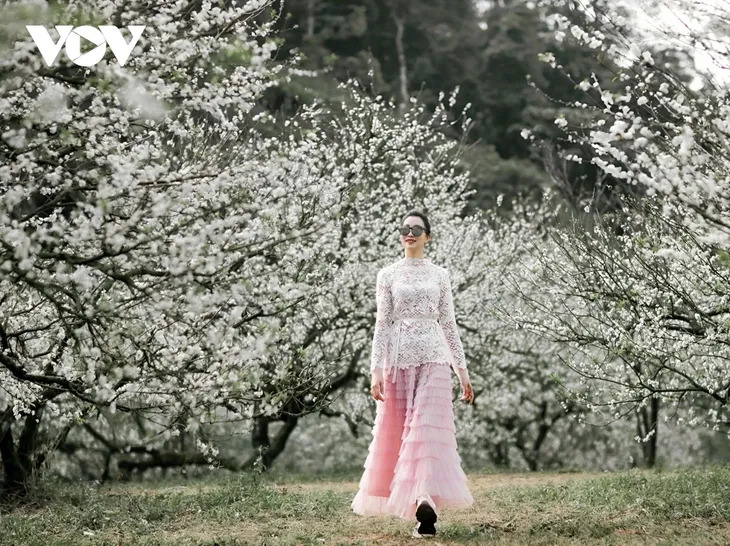 The plum flowers appear in delicate clusters and soft streaks, creating a gentle beauty unique to Moc Chau amid the morning mist. |