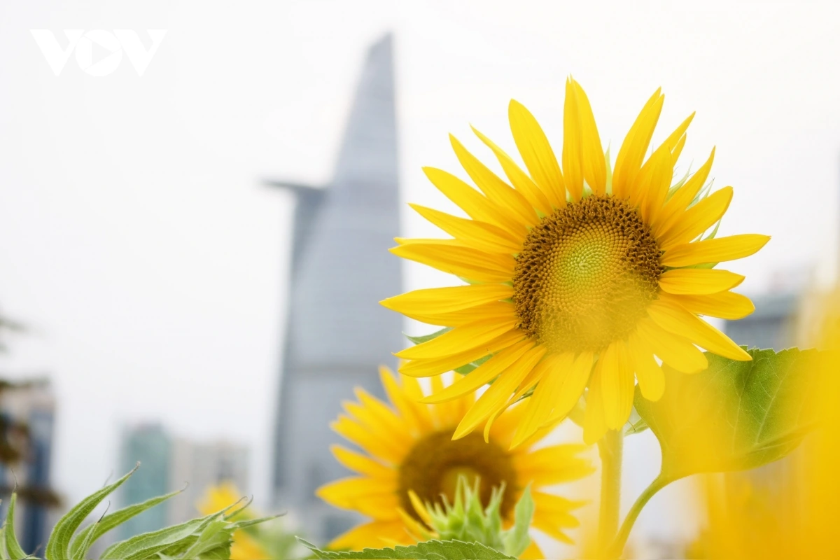 Ho Chi Minh City landmarks, such as the Bitexco building and Thu Thiem 2 bridge, can be seen behind the sunflower field. |