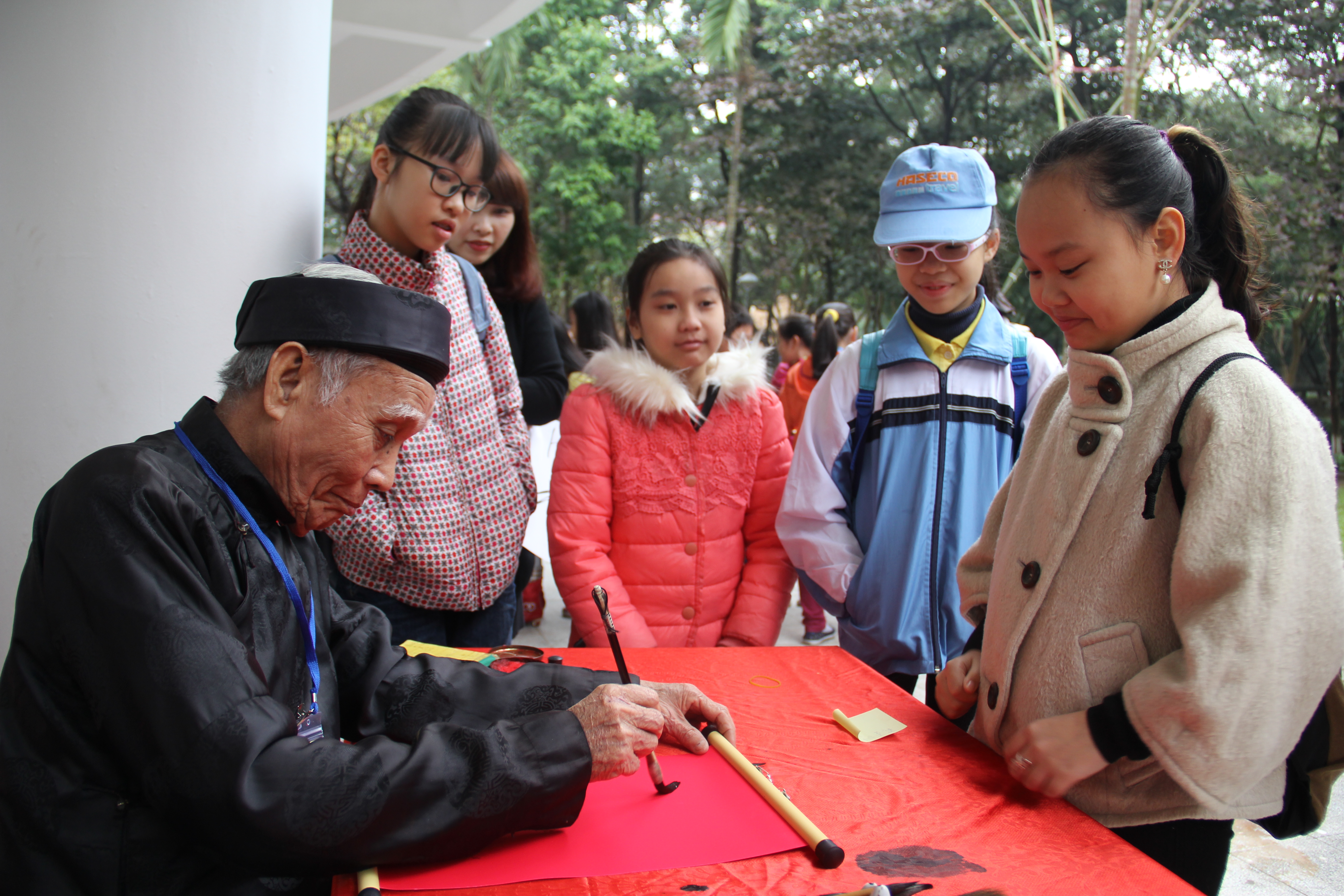 | A small customer is eager to watch calligrapher writing calligraphy. |