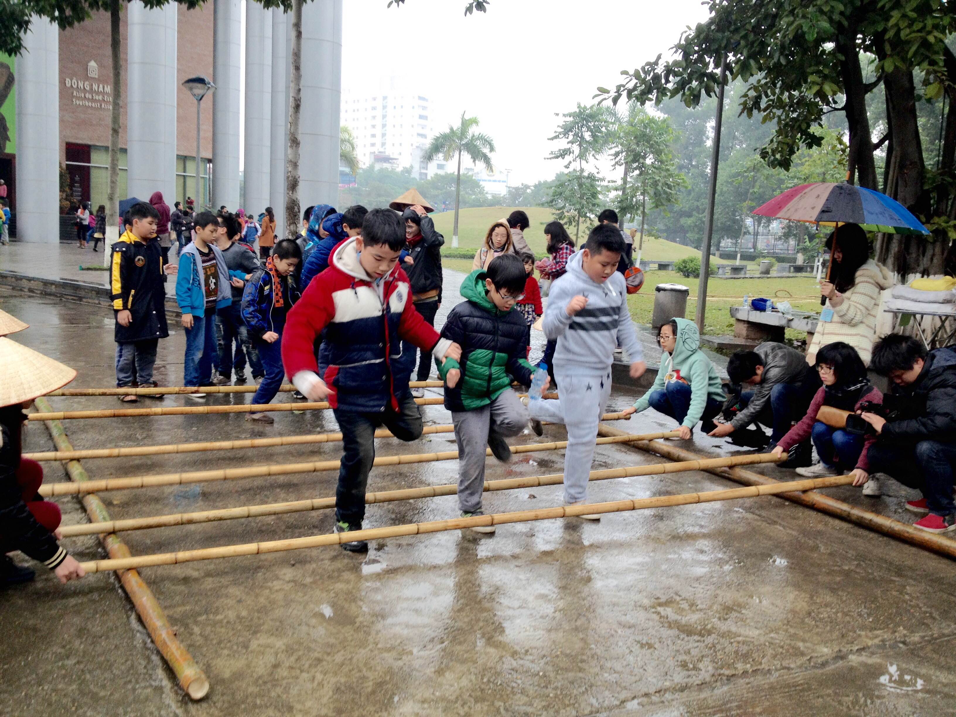 At another venue, some people are trying the stilt walking game. With the help of a museum’s volunteer, even children can master this game. 11-year-old Do Hong Thuy said: Today, I’ve had a chance to learn about calligraphy, make Chung cake, and play the stilt walking game. It’s the first time I’ve tried stilt walking but after being instructed for only 5 minutes, I now can walk steadily. I want to tell people who don’t know how to play that with some effort they can do it.