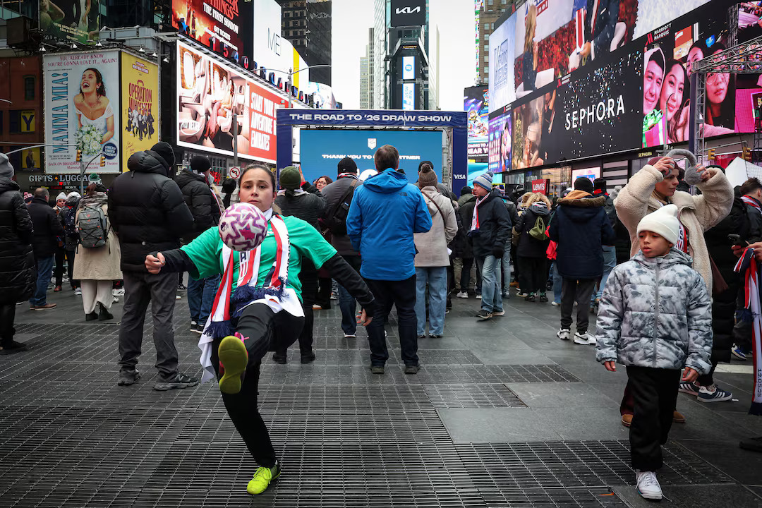 People gather to watch the FIFA World Cup 2026 Draw on a screen in Times Square in New York City, US on December 5, 2025. (Photo: REUTERS/Brendan McDermid) |