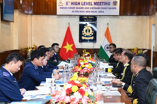 A delegation of Vietnam Coast Guard officers led by Major General Ngo Binh Minh, Commander of Coast Guard Region 3, attend the 5th High-level Meeting on Tuesday in New Delhi. The Indian side was led by Inspector General Anupam Rai, Deputy Director General of Operations and Coastal Security.