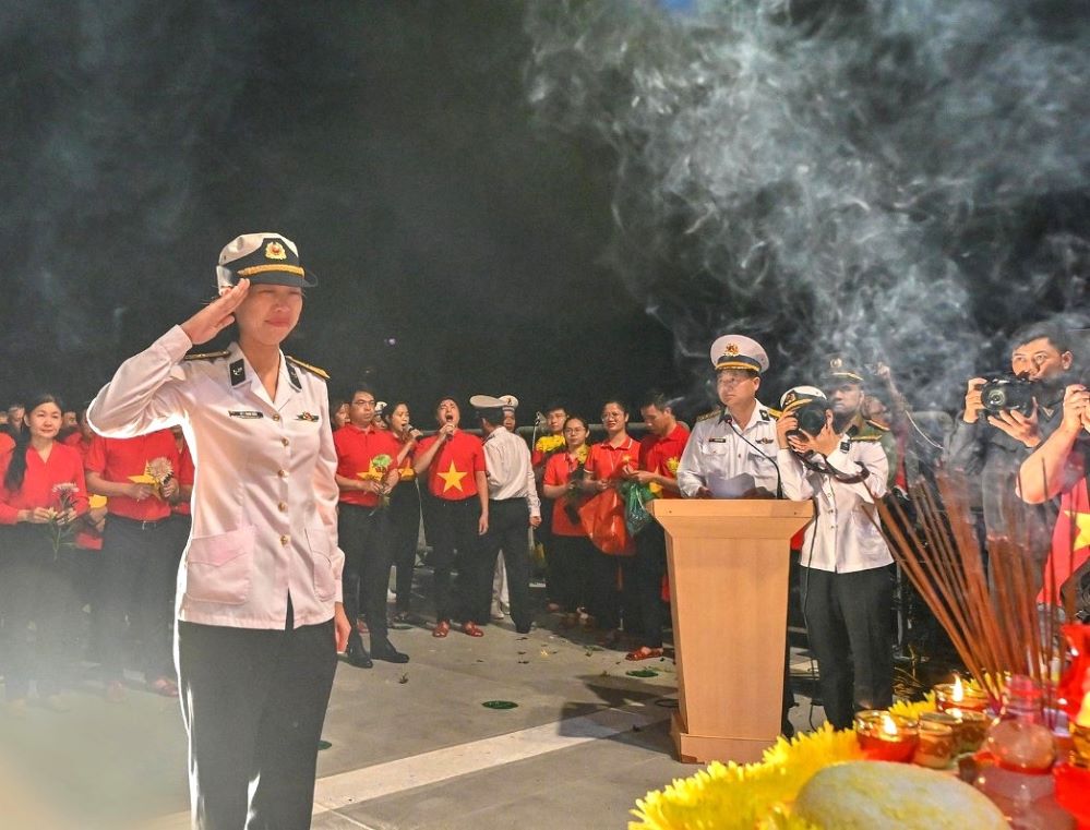Major Le Thi Minh Thuy visits the Truong Sa archipelago and burns incense for her father and his comrades in arms. (Photo: VOV) |