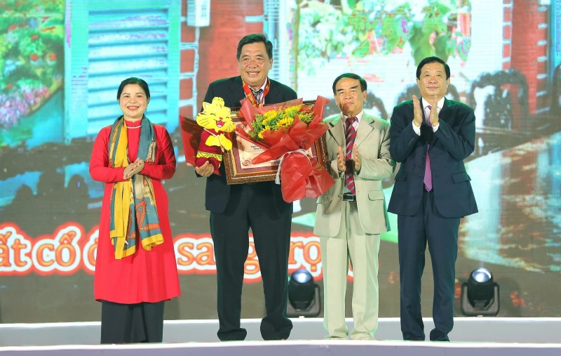 Tu Buoi (second from left) receives a certificate from the Vietnam Records Organization for his ceramic house. (Photo: the Vietnam Records Organization)