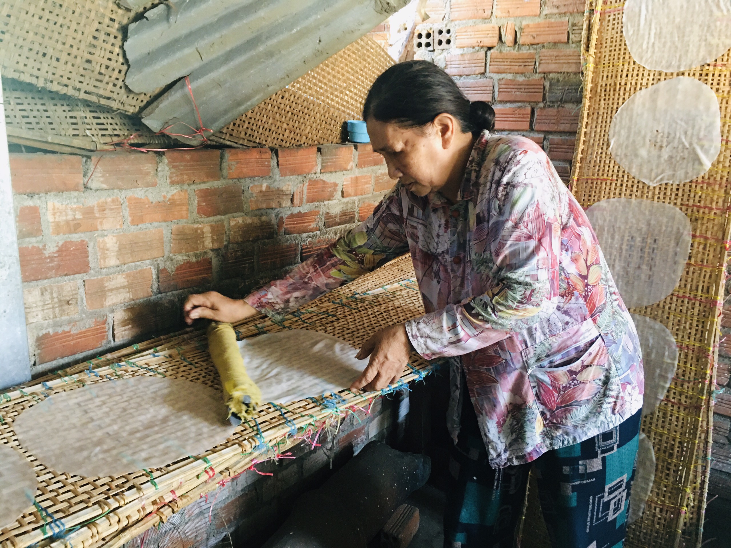Полученный рисовый блин осторожно перемещают на большие бамбуковые решетки и несколько часов просушивают на свежем воздухе. |