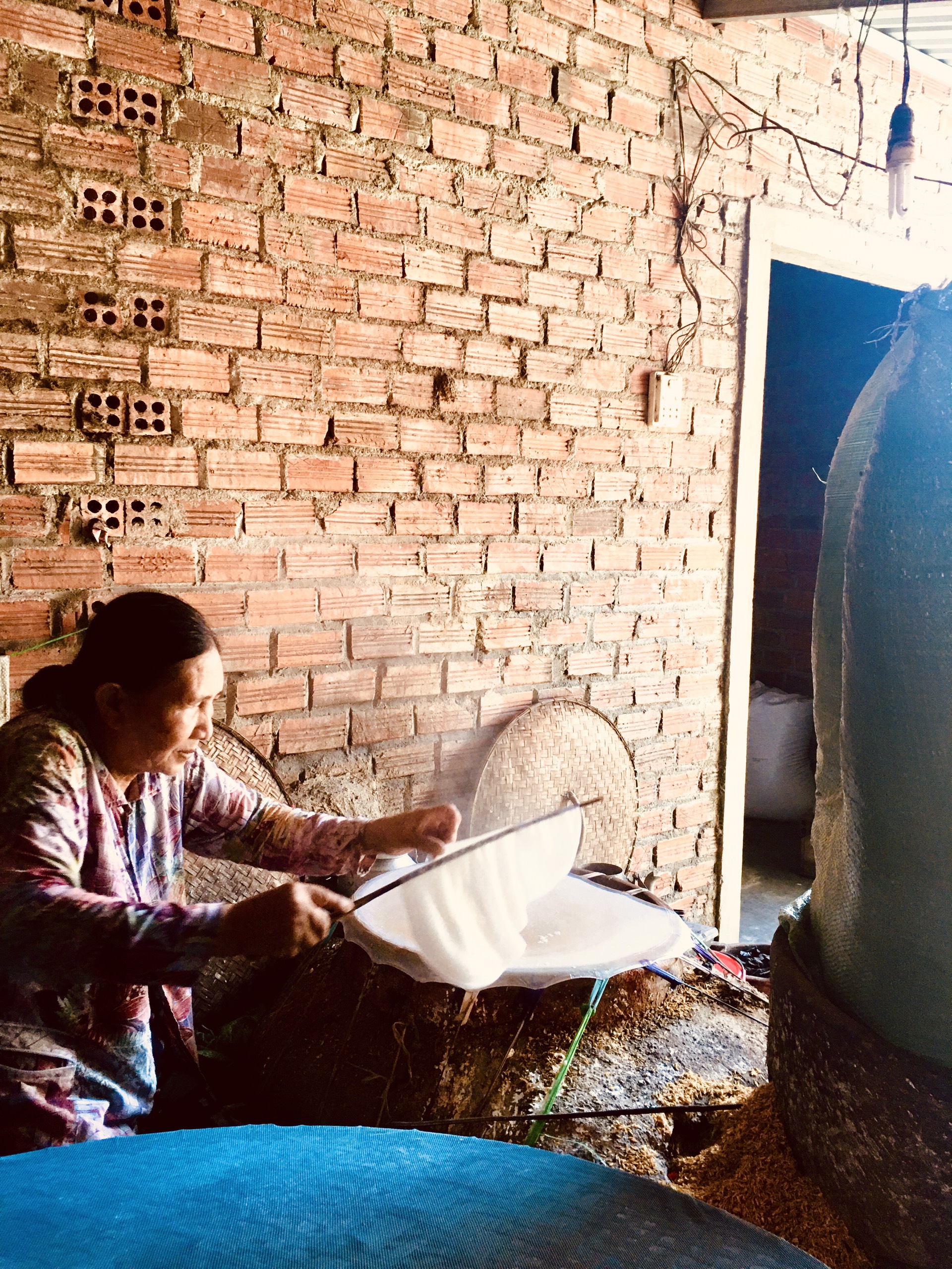 После набухания риса, из него готовят подобие блинного теста – размякшую рисовую крупу максимально быстро измельчают с помощью больших тяжелых ножей, выливают полученную массу на ткань, которая натянута над кастрюлей с кипящей водой, и держат там пару минут. Готовую галету можно есть сразу или свернуть в рулет с разными начинками, такими как отварная свинина, свежие овощи, вермишель и др.