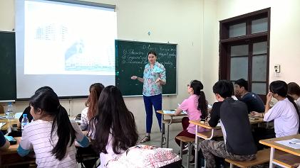 Так проходят занятия студентов Факультета русского языка и русской культуры Института иностранных языков при Ханойском государственном университете. Галина Валадимировна Шершукова – преподаватель Факультета доуниверситетского образования Белорусского государственного университета в Минске – сейчас находится на месячной стажировке во Вьетнаме. Рассказывая о своей рабочей программе, она сообщила: «Это специальная программа по взаимному соглашению между Министерством образования Республики Беларусь и Министерством образования и подготовки кадров Вьетнама. Какую-то часть расходов мне оплачивает мой университет, а какую-то – вьетнамская сторона; это и моё прибытие сюда, и проживание, и т.д. Я – преподаватель русского языка как иностранного. Я – носитель языка, поэтому ребятам интересно со мной работать».