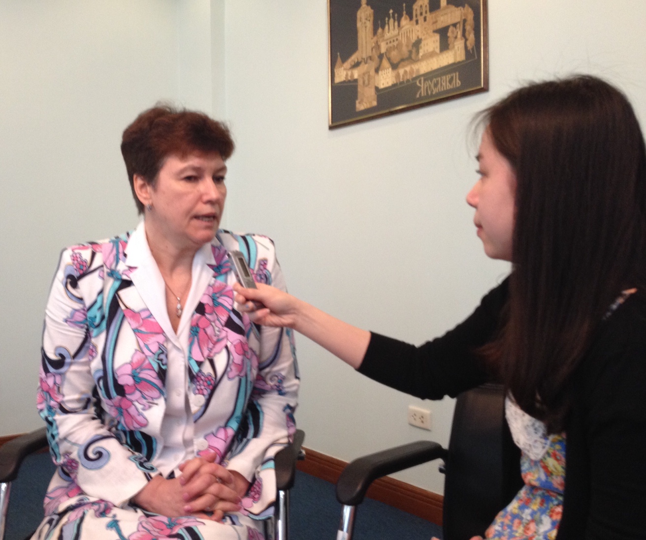 | Директор российского Центра науки и культуры в Ханое Елена Зубцова дает интервью корреспондентке радио "Голос Вьетнама". Фото: VOV/ Phuong Chi |