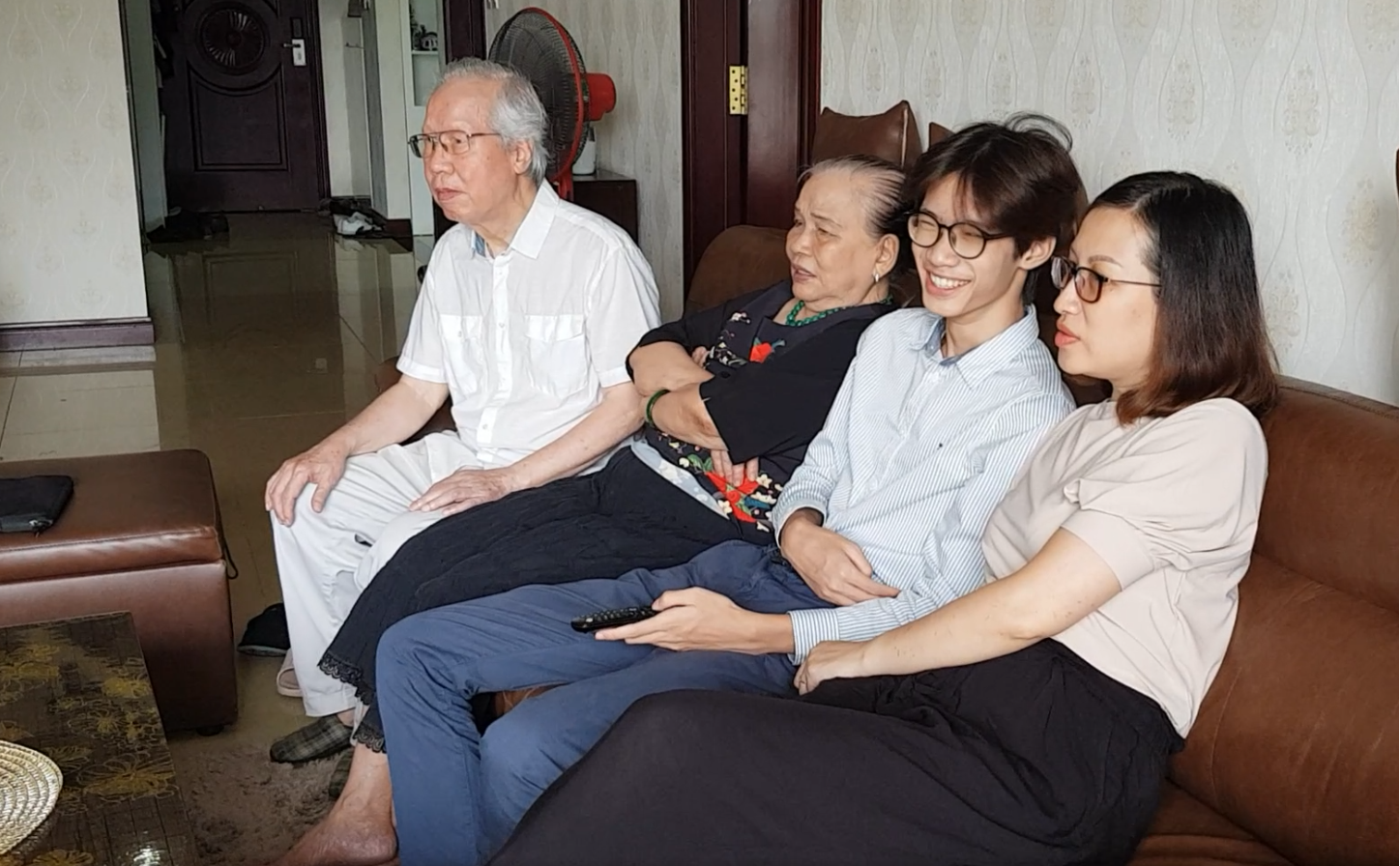 Фонг с мамой, бабушкой и дедушкой смотрит ещё раз своё выступление на вокальном конкурсе.