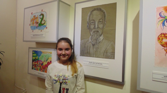 Между тем, 10-летняя Радченко Елизавета из города Сочи написала портрет президента Хо Ши Мина. Дедушка, бабушка и родители часто рассказывают ей о Хо Ши Мине, поэтому она представляет, что великий вождь вьетнамского народа был очень добрый, как Российский Дедушка Мороз: «Я написала эту картину, потому что слышала от родителей то, что Хо Ши Мин является символом Вьетнама. Что он для вас очень дорог. Я захотела его изобразить на этой картине, чтобы он всегда радовал вас».