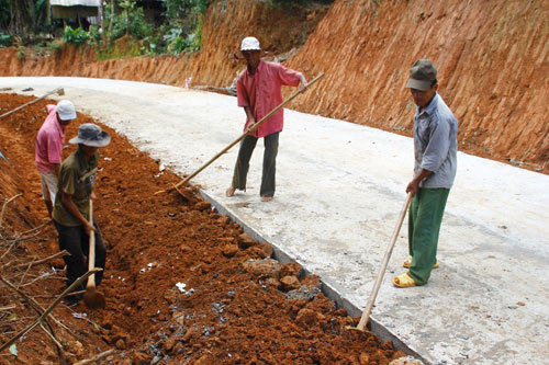 Программа строительства новой деревни получает поддержку не только со стороны жителей равнинных районов, а также и со стороны населения горных уездов провинции Биньдинь. В 2012 году власти горного уезда Виньтхань совместно с местными жителями построили около 22 километров деревенских дорог. Все площади под строительство дорог были отданы местными жителями добровольно. Они также пожертвовали деньги для покупки стройматериалов и отвели трудодни для участия в строительстве дорог. Заместитель председателя Народного комитета уезда Виньтхань Ле Ван Дау сказал: «Самым трудным в строительстве дорог является освобждение площади. Но в уезде Виньтхань эффективно выполняется пропагандистская работа, поэтому освобождение площади идёт очень благополучно. Местные жители готовы отдать часть своей земли для строительства дорог. Однако мы сталкиваемся с некоторыми трудностями в выполнении программы строительства новой деревни. Пока нам нелегко отвечать некоторым из 19-и критериев строительства новой деревни, например, критерию по сокращению количества малоимущих семей до отметки ниже 5 процентов».