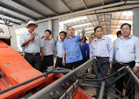 | Председатель ЦК Отечественного фронта Вьетнама Нгуен Тхиен Нян проводит осмотр модели производства риса на большом поле кооператива Кхиеттам. Фото: VGP/Hoаng Long |