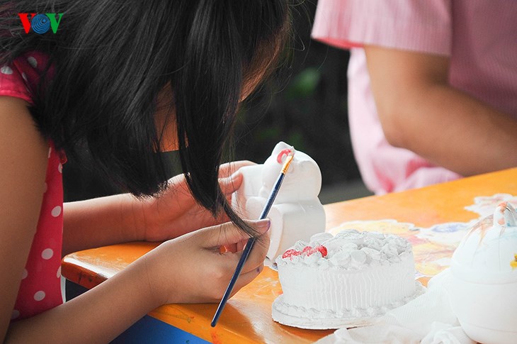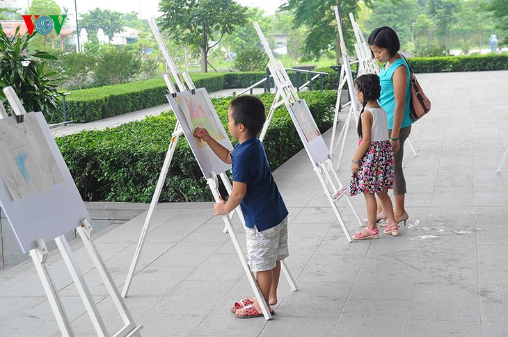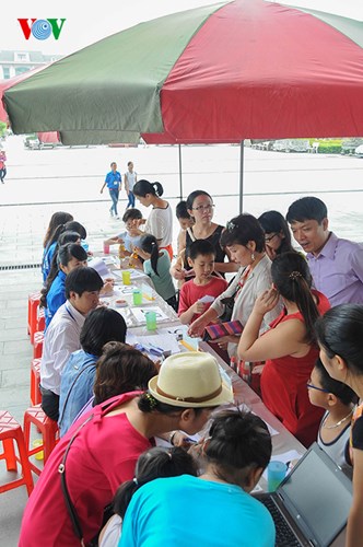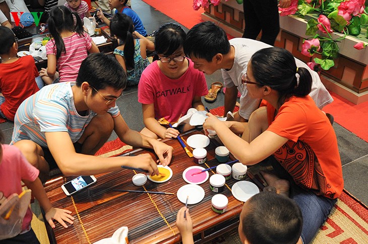 | Родители помогают своим детям в мероприятиях, проходящих в Ханойском музее. |