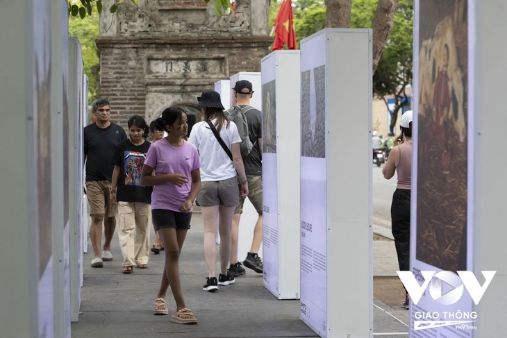 Посетители любуются фотовыставкой под открытым небом, которая проходит на пешеходной улице вокруг озера Хоанкием в центре Ханоя. |