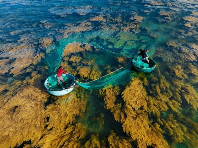 В сезон водорослей к острову Хонкхо приплывают размножаться и расти многие морские обители, такие как рыбы, креветки, кальмары и планктон. Правительство Вьетнама запретило сбор морских водорослей, чтобы защитить экосистему, а лишь разрешило сбор морепродуктов только с использованием одинарных или двойных корзин. Фото: Hon Kho Trip.