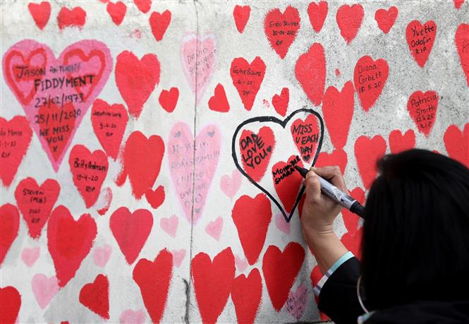 Пишуют сообщение на стене в память о погибших от COVID-19 в Лондоне. Фото: Синьхуа/ VNА
