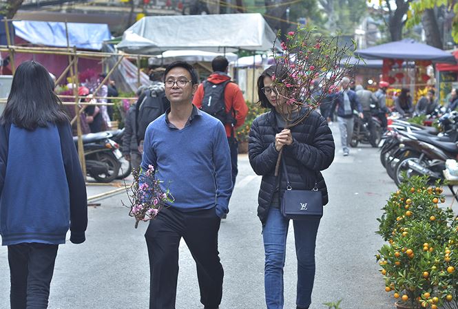 Streets in Hanoi have become more crowded and colorful when Tet approaches. Flower markets are vivid with pink peach blossoms, yellow apricot blossoms, and other types of flowers and bonsais. Hang Ma street turns red with lanterns, parallel sentences, and other decorative items.