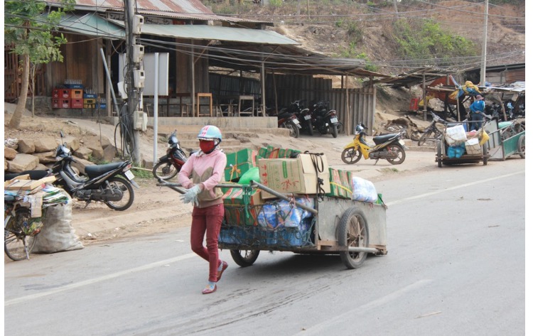 Nguyen Thi Thuong, Head of the Women’s Union in Ka Tang hamlet, is also the founder of the rickshaw team. Thuong said that in 2003, farm-work could not support daily life while the border trade was being developed, Thuong asked her sister-in-law to transport goods over the border. She earned around 70 cents per shipment. In order to improve the work opportunities and incomes, the sisters made a rickshaw for their own. Thanks to the rickshaw, they could transport hundreds kilos of goods, bringing a 5-6 fold increase in income: “At first, we made two rickshaws, then we increased to 10. We also asked other poor women in the hamlet to work with us and generate some more income for them”.