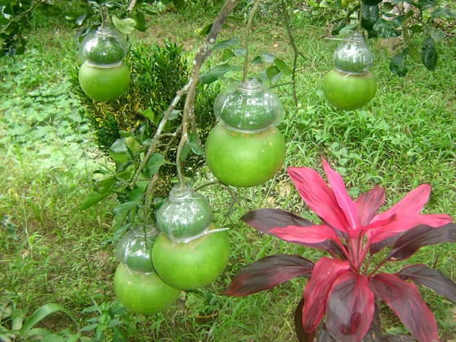 Vo Trung Thanh was the first farmer in the Mekong Delta to produce pomelos in gourd shapes in 2009. It was a fruit of his project over several years to grow pomelos in gourd moulds. Since then the Shaping Fruit Club in Phu Tri A hamlet, Phu Tan commune, has diversified their products for Tet including prosperous gourd-pomelos, gold-bar gourd-pomelos, coin-shape gourd-pomelos, Happiness-Wealth-Longevity gourd-pomelos, and Buddhist hand pomelos.