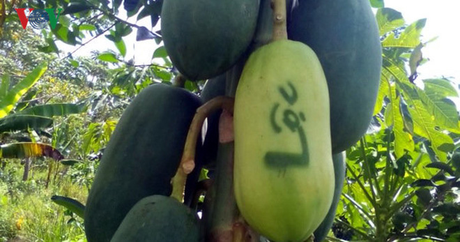 Nguyễn Thị Ướm said she and some farmers have worked together to shape 1,400 papayas. Traders have bought wholesale from between 7 to 10 USD. Ms. Uom said: “The 5-fruit tray custard-apples, papayas, and mangoes. The green or yellow papayas look simple. We have shaped them and produced the words happiness, wealth, longevity, and talent with contrasting colors on them. We also have changed the green color of custard-apples to yellow.”