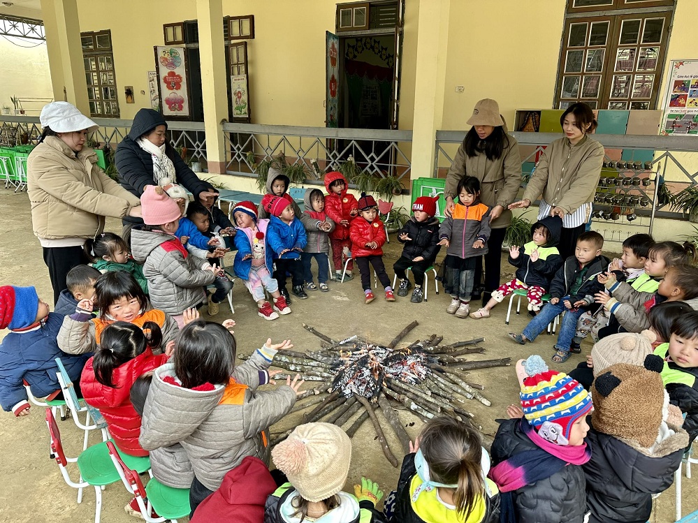 Teachers and students of Binh Minh Co Ma kindergarten in Thuan Chau district, Son La province, start a fire to keep warm. (Photo: VOV) |