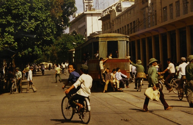 | Journalist Michel Blanchard is introducing his photo on an electrical tram on Hang Dao Street in 1984. (Photo: vietnamnet.vn) |