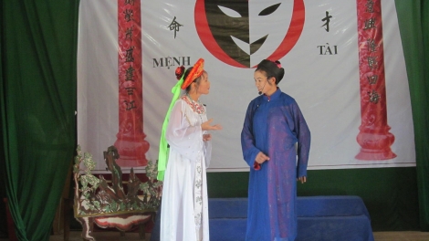(VOVworld) – “The tale of Kieu” by famous Vietnamese poet Nguyen Du has been adapted to several genres including Cheo popular theater and Tuong classical opera. A memorable scene featuring a jealous lady from “The tale of Kieu” has been adapted for a Cheo performance in Chuong village, Tan Phong district, Hai Duong province as part of activities to honor Nguyen Du on his 250th birthday.