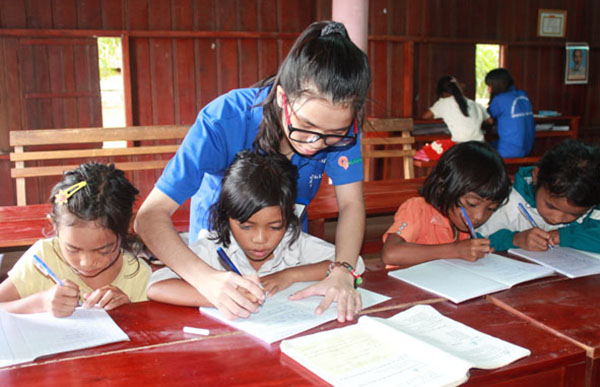 | A volunteer is teaching local children to write. (Photo: dantri.com) |