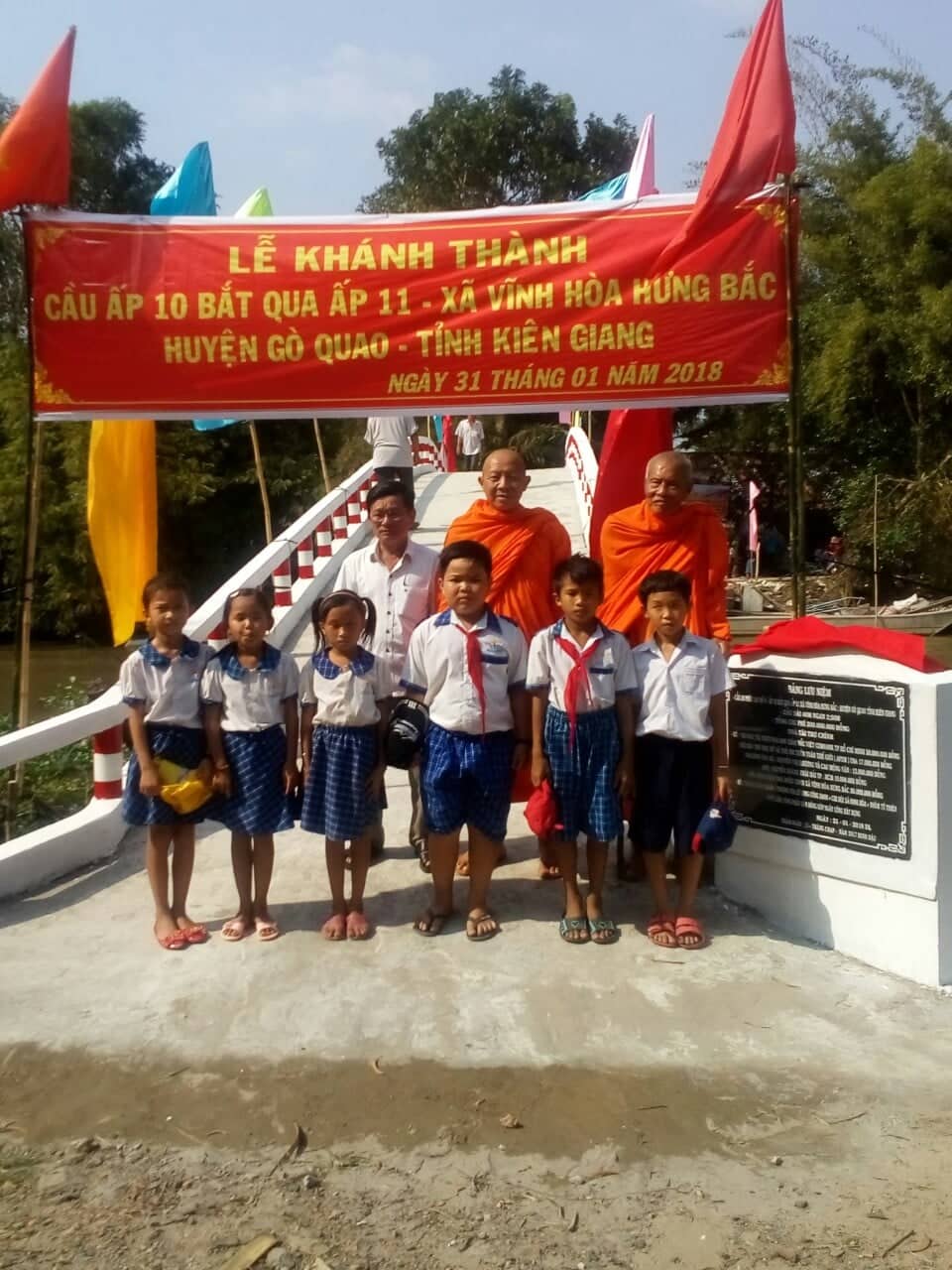 The 30-meter-long bridge was sponsored by a benefactor. Monk Ly Long Cong Danh, who leads Thuy Lieu pagoda and the pagoda’s bridge building team volunteered unpaid work-days for the project.