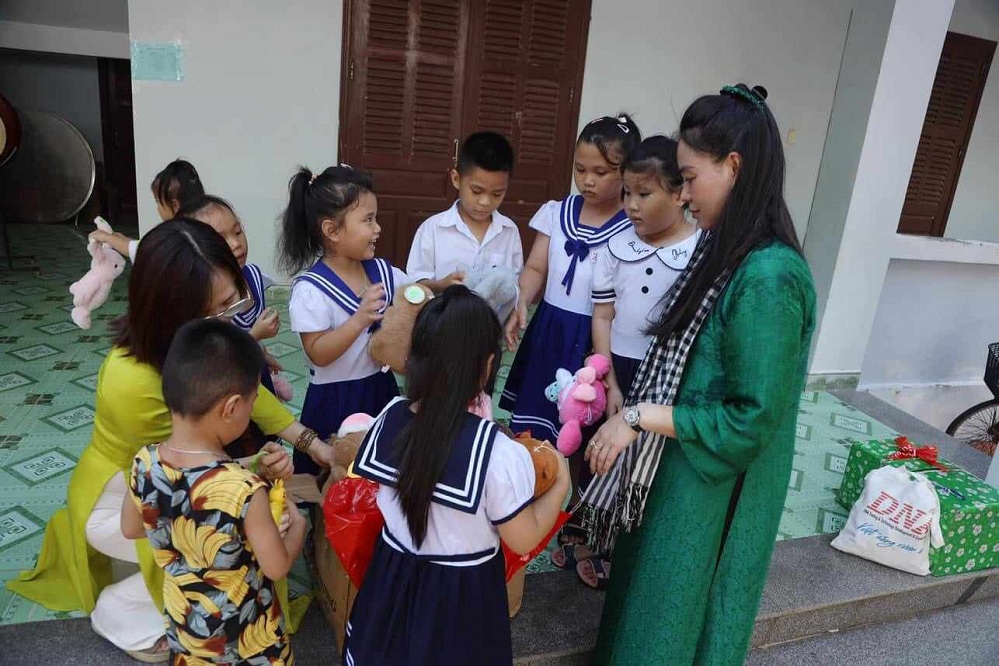 Ms. Quyen in green traditional dress presents gifts for children in Truong Sa town.