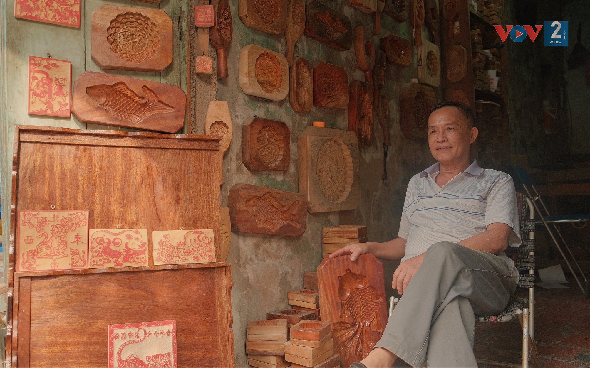 Located in a small corner on Hang Quat street, Hanoi, Quang’s cake mold shop looks much smaller than other shops on the busy street. In the 20 square-meter shop, there are various kinds of molds. Quang makes not only mooncake molds but also wooden molds to make cakes of steamed sticky rice and wood carving pictures for temples and pagodas. Quang said his family has been involved in the carpentry craft for many generations in Thuong Cung village, Thuong Tin district, Hanoi. In the early 20th century, Quang’s family moved to the Old Quarter and ever since has lived on the mold making craft. Mr. Quang said: “In the past, mooncakes were a luxury cuisine in Vietnam. Only people in big cities like Hanoi, Hai Phong and Nam Dinh were able to purchase moon cakes for worship during Mid-autumn festival. Our trade mainly served wealthy people. That’s why we moved to big cities like the capital city of Hanoi which was the land of the King and mandarins to do our craft”.