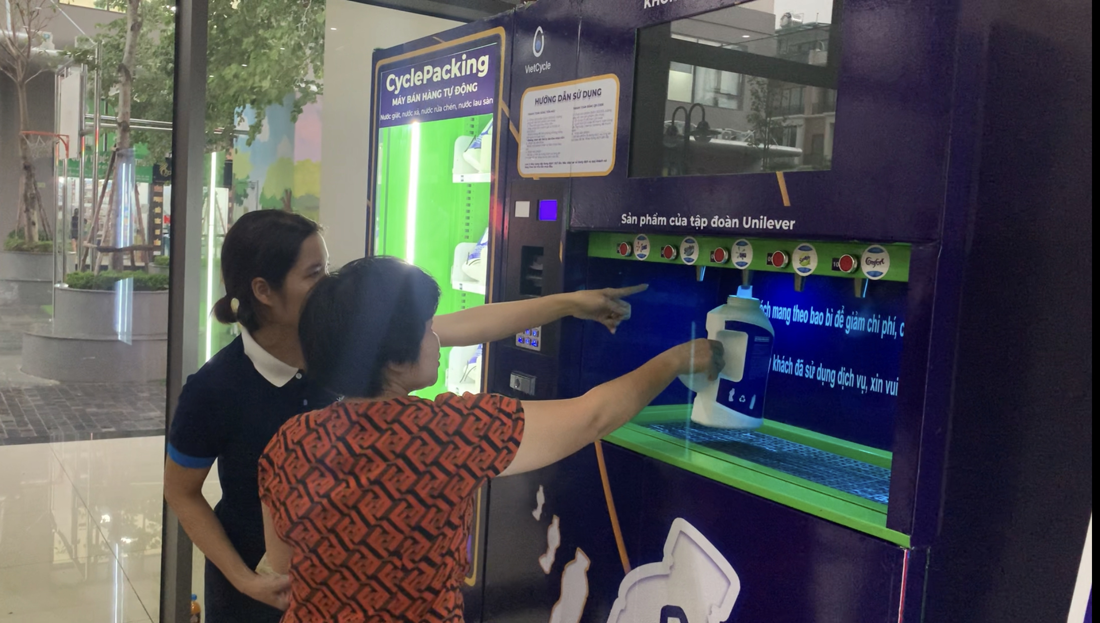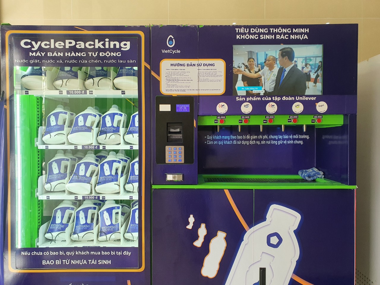 Vietcycle machine is a solution that automates sales transactions. Customers bring their own containers to be refilled by the machine for laundry detergent, softener, dishwashing liquid, and floor cleaner, and pay via a QR code.