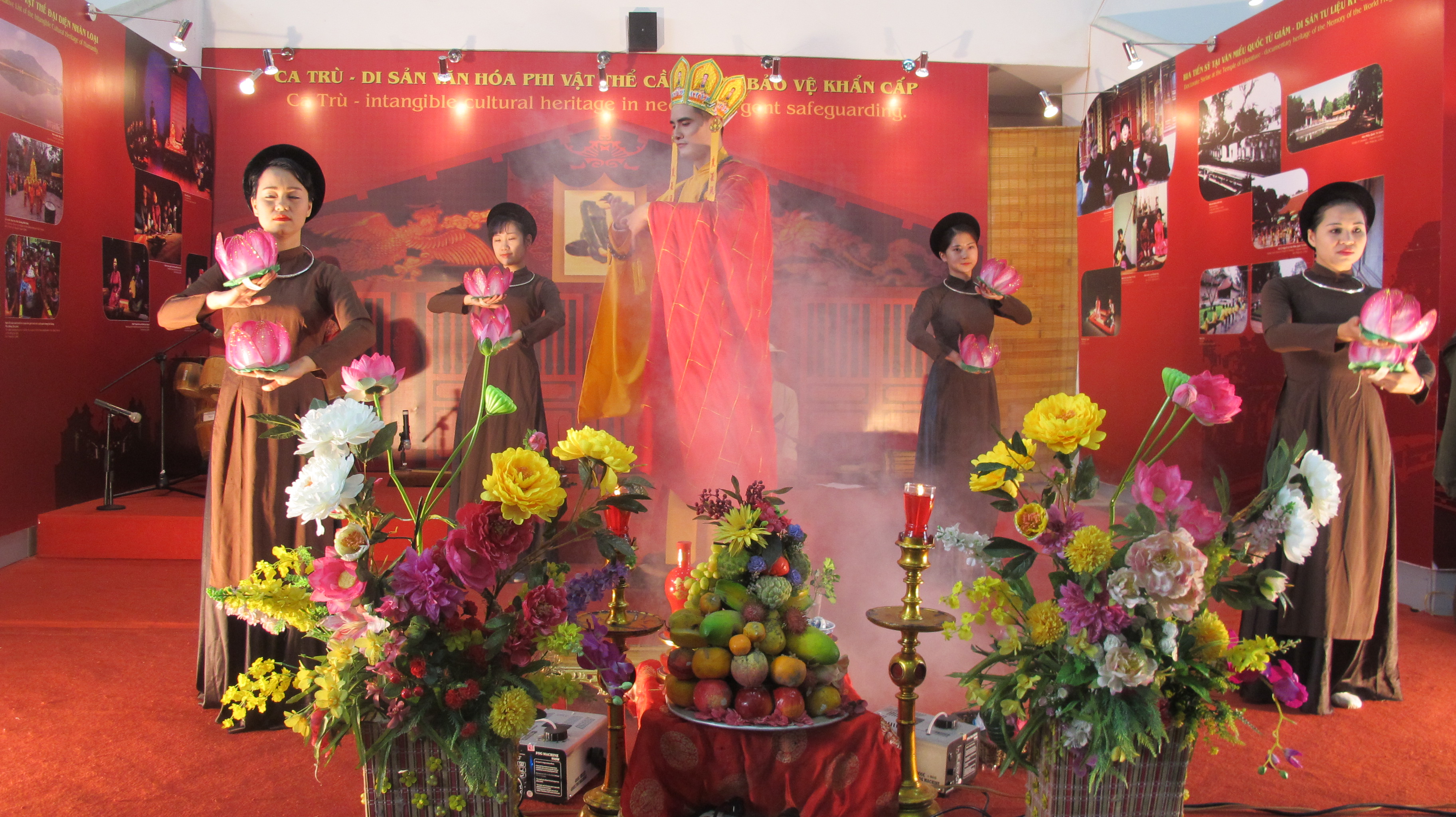 Performances always require strict dressing regulations. For example, in Chau Van or ritual singing, each saint has a typical type of clothing which represent each saint’s occupation and background. Other performing props represent the place where the saint lives. If the saint lives in the forest, fire, candles, flowers and fruits must be required on stage. Or if he lives in a river or ocean, a layer of smoke will represent his epiphany. For such a role as the Guanyin, there must be a transparent chiffon. A bodhisattva must hold a gourd.