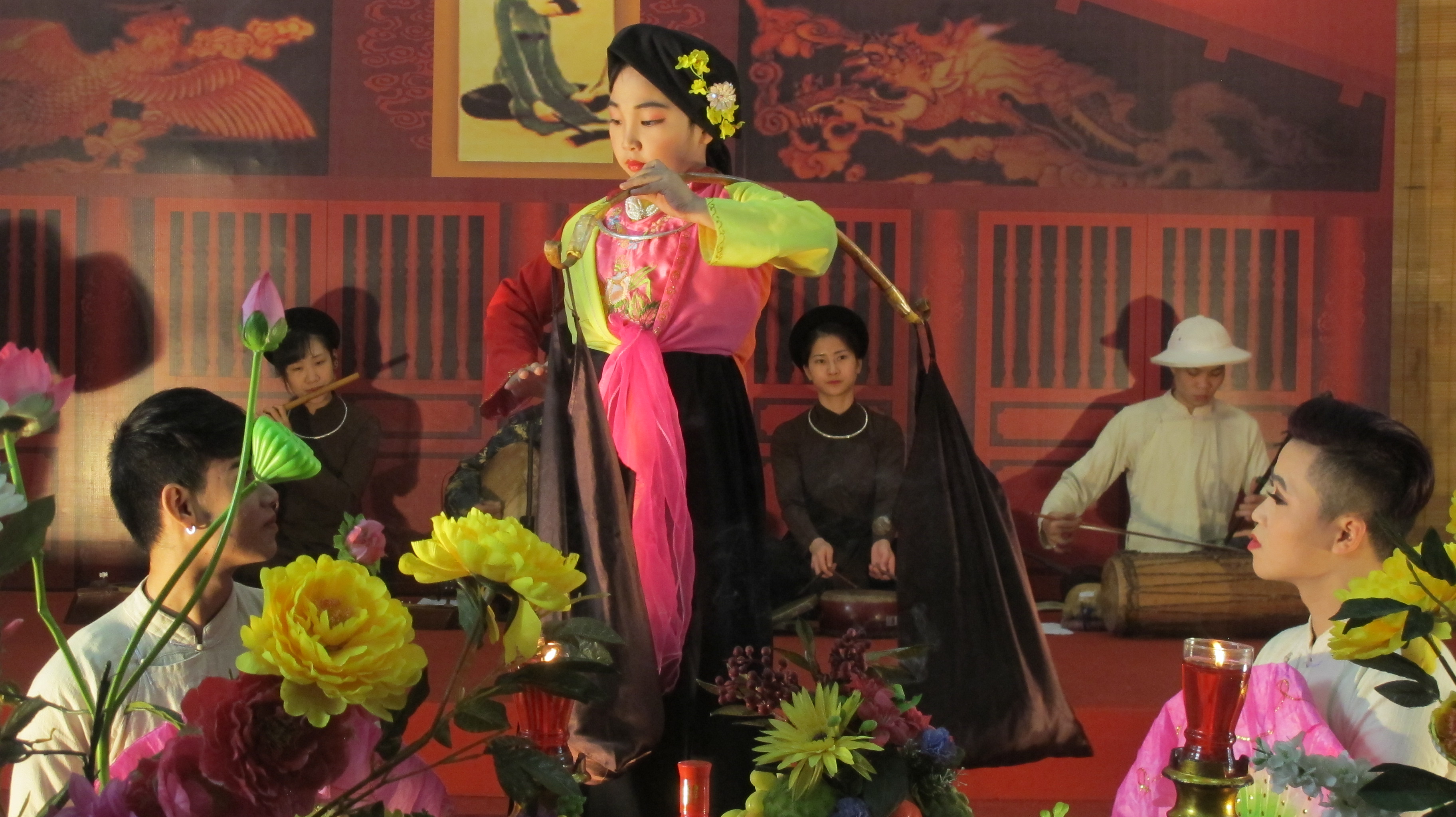 At 8’30 am on Saturday, at the Imperial Citadel of Thang Long, a world heritage site, an artists group from the Vietnam Traditional Music Development Center were almost finishing up preparations for the show. Behind the scenes, some people were working on the make up and clothing for each other, while others, however, were preparing staging techniques and decorations. The show was due to start at 9.00 am, so preparation must be prompt. A show normally comprises of 6 performances, by individual and combined artists. Nguyen Xuan Quynh is a young singer from the Vietnam Traditional Music Development Center. Today’ show will last for about 1 hour and a half, with many performances. The center mobilizes more than 20 people for each show. Visitors here may include both invited guests as well as tourists.
