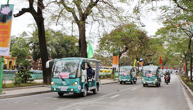 Electric cars carry visitors around West Lake.(Photo: tienphong.vn)