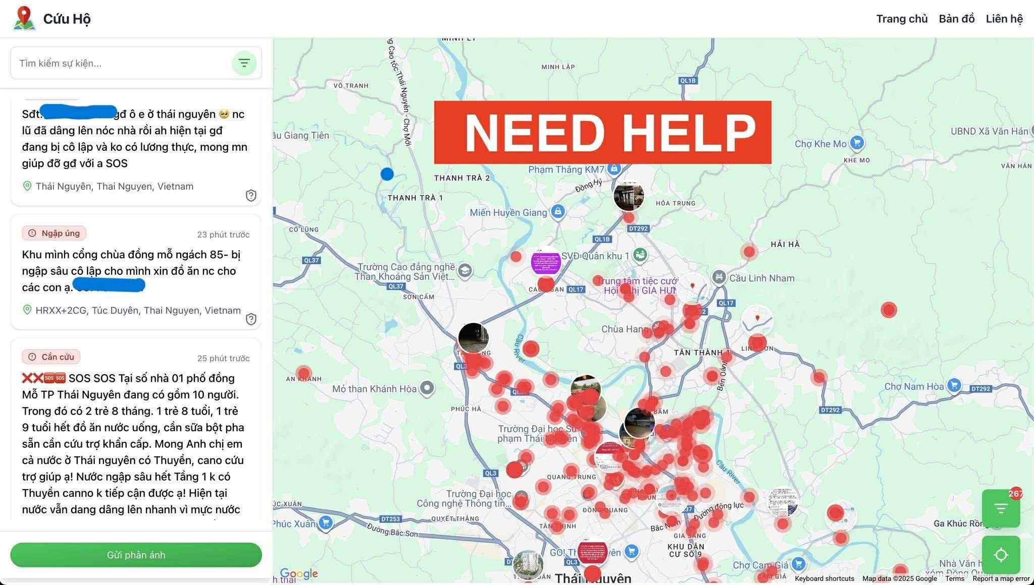 Before dawn, thongtincuuho.org went live and quickly went viral among rescue forces. Within hours, hundreds of red pins appeared on the map, each representing a call for help.