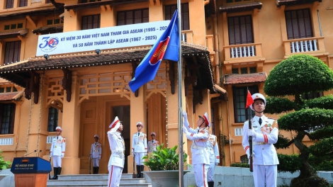 (VOVWORLD) - ในโอกาสฉลองครบรอบ 58 ปีวันก่อตั้งอาเซียน 8 สิงหาคมและ 30 ปีเวียดนามเข้าเป็นสมาชิกอาเซียน เช้าวันที่ 8 สิงหาคม ณ สำนักงานใหญ่กระทรวงการต่างประเทศในกรุงฮานอย ได้มีการจัดพิธีเชิญธงอาเซียนเข้าสู่ยอดเสาเพื่อเชิดชูคุณค่าและคำมั่นส่งเสริมความสามัคคี มิตรภาพและความร่วมมือในประชาคมอาเซียนเพื่อสันติภาพ ความร่วมมือและความเจริญรุ่งเรืองในภูมิภาค