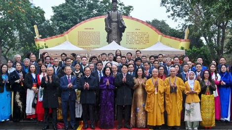 ประธานประเทศพร้อมคณะผู้แทนชาวเวียดนามที่อาศัยในต่างประเทศจุดธูปสักการะที่อนุสาวรีย์กษัตริย์ลี้ท้ายโต๋และวัดหงอกเซิน