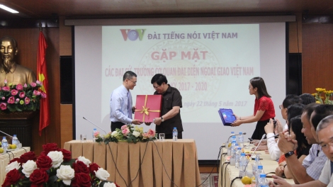 (VOVWORLD) - วันที่ 22 พฤษภาคม ณ สำนักงานใหญ่ของสถานีวิทยุเวียดนามหรือวีโอวีในกรุงฮานอย นาย เหงียนเท้กี๋ ประธานของวีโอวีได้ให้การต้อนรับบรรดาเอกอัครราชทูต หัวหน้าสำนักงานตัวแทนการทูตเวียดนามในต่างประเทศวาระปี 2017-2020