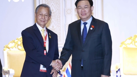 (VOVWORLD) - ในกรอบการประชุมสมัชชาใหญ่รัฐสภาอาเซียนหรือไอป้าครั้งที่ 43 บ่ายวันที่ 21 พฤศจิกายน ณ กรุงพนมเปญ ประเทศกัมพูชา ประธานสภาแห่งชาติ เวืองดิ่งเหวะ ได้พบปะกับนายชวน หลีกภัย ประธานสภาผู้แทนราษฎรของไทย