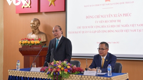 ประธานประเทศเหงวียนซวนฟุกไปเยี่ยมและพูดคุยกับเจ้าหน้าที่ พนักงานสถานทูตและชมรมชาวเวียดนามในประเทศไทย