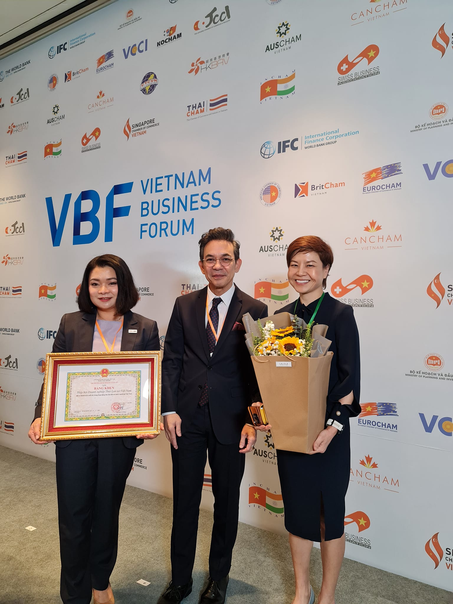 นางสาว พยอม นาหอคำ รองประธาน Thai Cham (คนที่หนึ่งนับจากซ้าย) เป็นตัวแทน Thai Cham มารับรางวัล certificate of Merit จากกระทรวงวางแผนและการลงทุนในฐานะที่มีส่วนช่วยในการดึงดูดนักลงทุนต่างชาติเข้ามาในประเทศเวียดนามเมื่อเดือนมีนาคมที่ผ่านมา (ภาพจากสถานเอกอัครราชทูตไทย ณ กรุงฮานอย) |