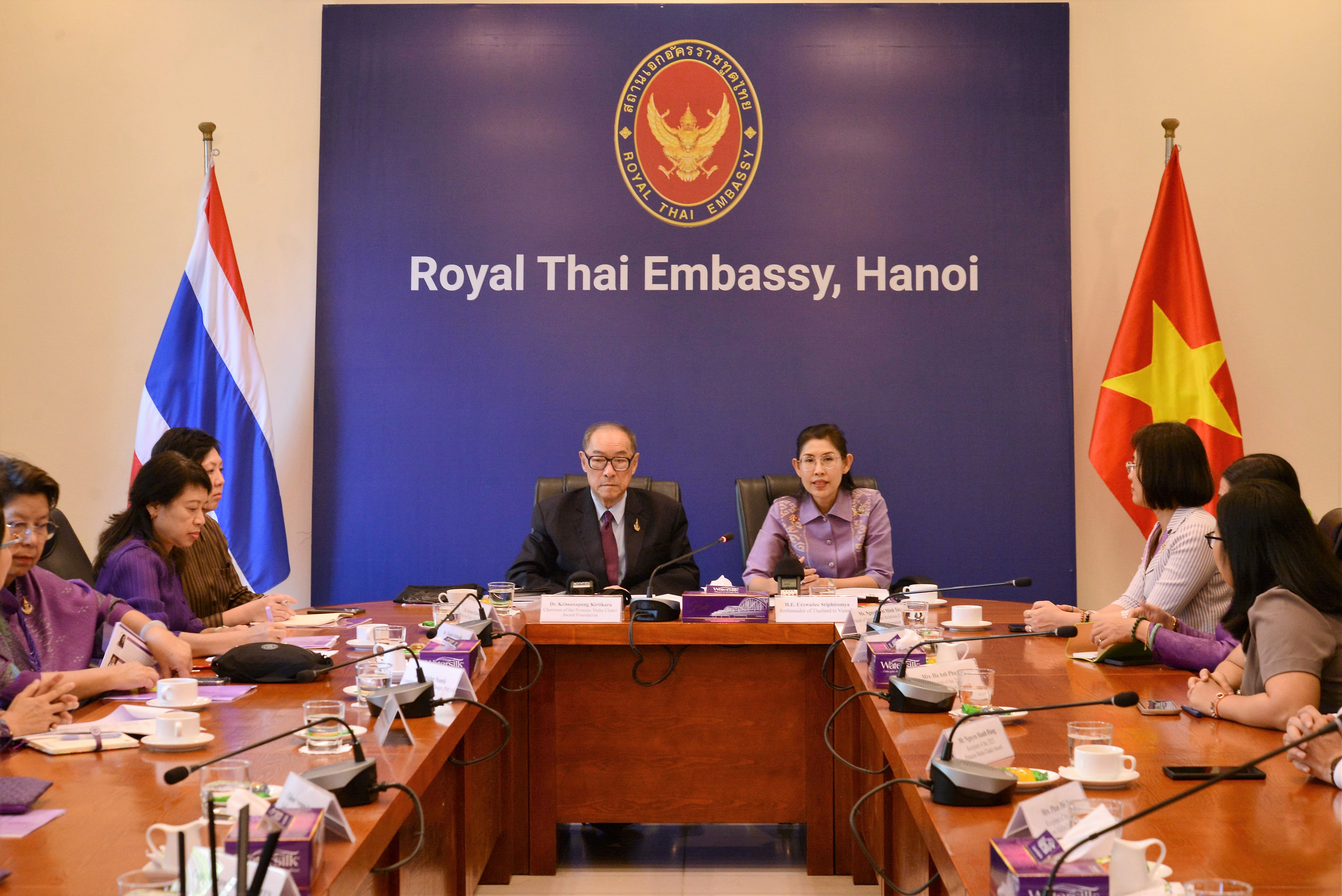 ดร.กฤษณพงศ์ กีรติกร ประธานกรรมการมูลนิธิรางวัลสมเด็จเจ้าฟ้ามหาจักรีและนางสาวอุรวดี ศรีภิรมย์ เอกอัครราชทูต ณ กรุงฮานอยเป็นประธานของงาน |