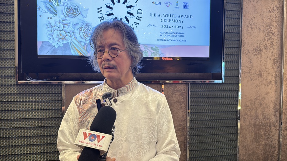 นักเขียน เหงวียนทามเถี่ยนเก๊ให้สัมภาษณ์นักข่าววีโอวีประจำประเทศไทย |