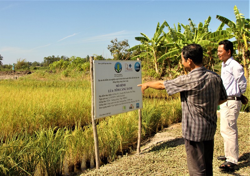ทุกๆวัน คุณเจิ่นวันเตี๊ยน จากหมู่บ้านหว่าเด ตำบลหว่าเต๊ อำเภอหมีเซวียนจังหวัดซอกจัง จะไปดูแลนาข้าวที่ปลูกข้าวพันธุ์ ST 24 และกุ้งที่เลี้ยงไว้ในนา คุณเตี๊ยนเผยว่า หลังจากเก็บเกี่ยวข้าวเสร็จก็จะจับกุ้งที่เลี้ยงไว้ พอถึงเดือนเมษายนก็จะสบน้ำเค็มเข้าพื้นที่เพื่อเลี้ยงกุ้งอีกรอบ ครอบครัวของคุณเตี๊ยนเป็นหนึ่งในหลายครอบครัวในพื้นที่ที่มีรายได้อย่างยั่งยืนจากการทำเกษตรรูปแบบนี้ “เราต้องปลูกข้าวหมุนเวียนกับการเพาะเลี้ยกุ้งเพราะที่นี่น้ำเค็มจะรุกเข้าพื้นที่เกษตรเป็นเวลา 6 เดือนและ 6 เดือนที่เหลือจะเป็นน้ำจืด หลังฤดูเพาะเลี้ยงกุ้ง ผมจะปล่อยน้ำจืดเข้ามาล้างน้ำเค็มให้ความเค็มหมดแล้วก็ปลูกข้าวต่อ”