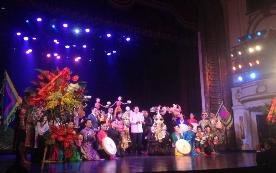 ![]() นายกรัฐมนตรีไทยและเวียดนามมอบดอกไม้ให้แก่ศิลปินโรงละครหุ่นกระบอกน้ำเวียดนามและโรงคะลครโจหลุยส์ของไทย